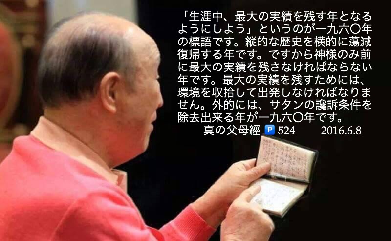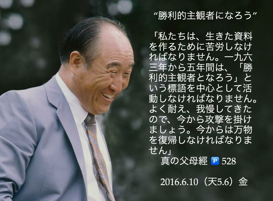 「私たちは、生きた資料を作るために苦労しなければなりません。ー九六三年から五年間は、「勝利的主観者となろう」と いう標語を中心として活動しなければなりません。よく耐え、我慢してきたので、今から攻撃を掛けましょう。今からは万物を復帰しなければなりません」