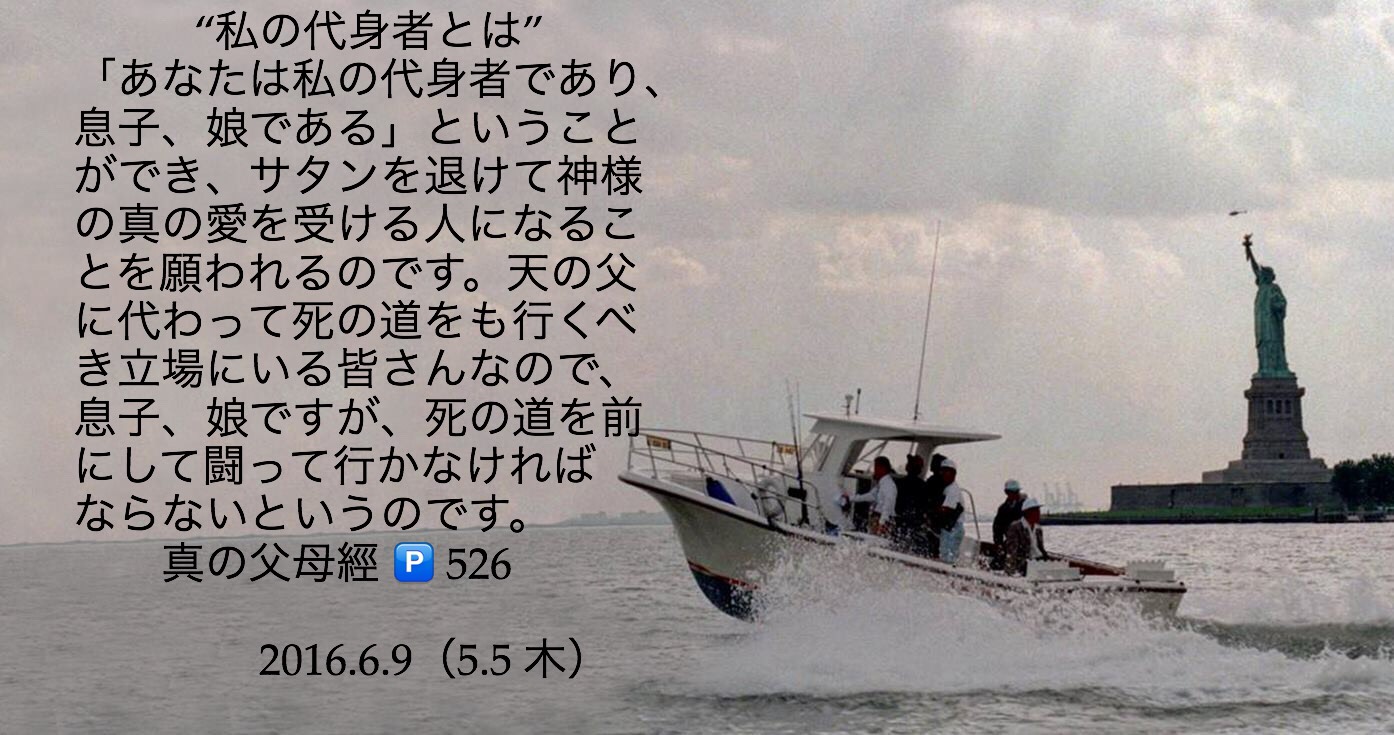 「あなたは私の代身者であり、 息子、娘である」ということができ、サタンを退けて神様の真の愛を受ける人になることを願われるのです。天の父に代わって死の道をも行くベき立場にいる皆さんなので、息子、娘ですが、死の道を前にして闘って行かなければならないというのです。真の父母經 P526 2016.6.9(木)