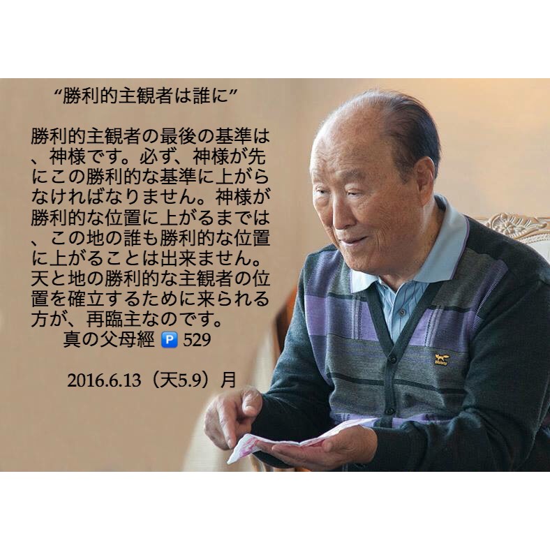 勝利的主観者の最後の基準は、神様です。必ず、神様が先にこの勝利的な基準に上がらなければなりません。神様が勝利的な位置に上がるまでは、この地の誰も勝利的な位置に上がることは出来ません。 天と地の勝利的な主観者の位置を確立するために来られる方が、再臨主なのです。 真の父母經 P529