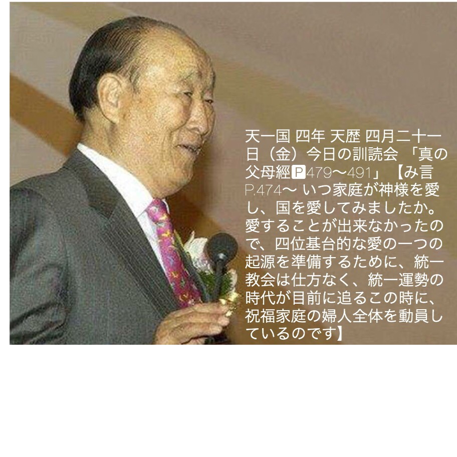天一国 四年 天歴 四月二十一日 (金) 今日の訓読会 「真の父母經P474~491」 【み言 P.474~いつ家庭が神様を愛し、国を愛してみましたか。 愛することが出来なかったので四位基台的な愛の一つの起源を準備するために、統一教会は仕方なく、統一運勢の時代が目前に追るこの時に、祝福家庭の婦人全体を動員しているのです】