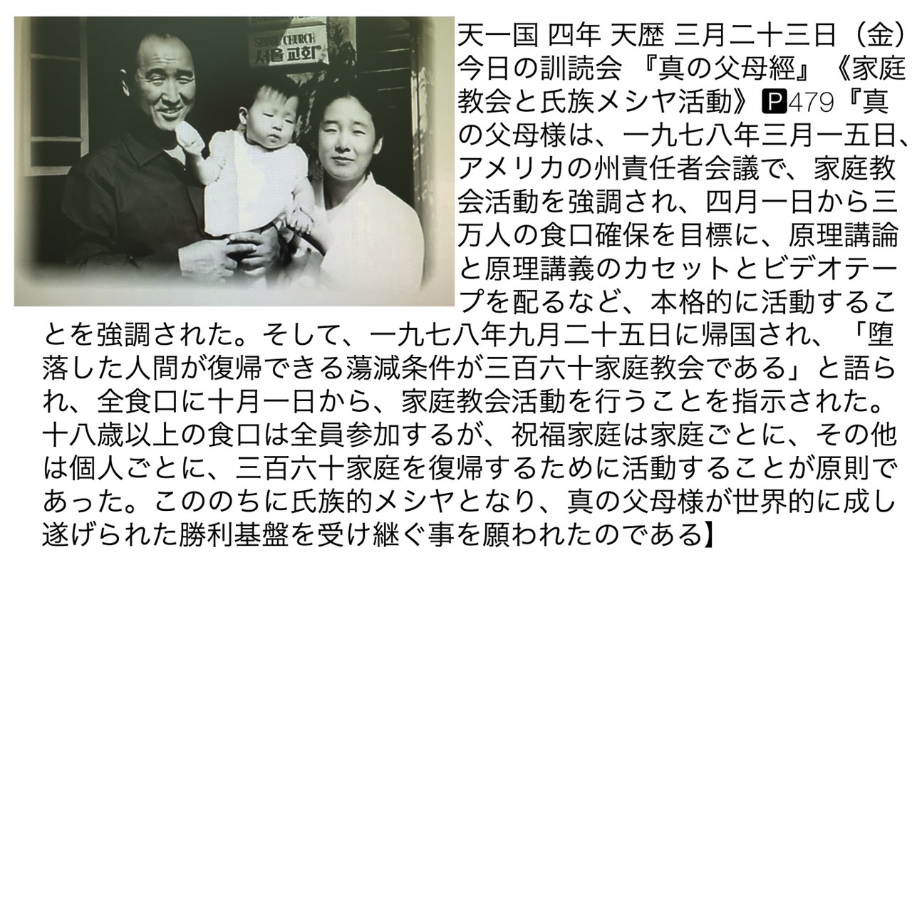天一国 四年 天歴 三月二十三日(金) 今日の訓読会 『真の父母經』 《家庭教会と氏族メシヤ活動》 P479 『真の父母様は、一九七八年三月ー五日、アメリカの州責任者会議で、家庭教会活動を強調され、四月ー日から三万人の食口確保を目標に、原理講論のカセットとビデオテープを配るなど、本格的に活動することを強調された。そして、一九七八年九月二十五日に帰国され、「堕落した人間が復帰できる蕩減条件が三百六十家庭教会である」と語られ、全食口に十月ー日から、家庭教会活動を行うことを指示された。 十八歳以上の食口は全員参加するが、祝福家庭は家庭ごとに、その他は個人ごとに、三百六十家庭を復帰するために活動することが原則であった。こののちに氏族的メシヤとなり、真の父母様が世界的に成し遂げられた勝利基盤を受け継ぐ事を願われたのである】