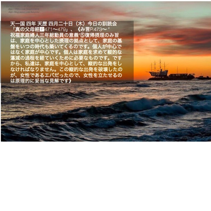 天一国 四年 天歴 四月二十日 (木) 今日の訓読会 『真の父母經P471~479」、《み言P473〜”祝福家庭婦人三年総動員の意義”⑤復帰摂理のみ旨は、家庭を中心とした摂理の拠点として、家庭の基盤をいつの時代も築いてくるのです。個人が中心ではなく家庭が中心です。個人は家庭を求めて縦的な蕩減の過程を経ていくために必要なものです。ですから、私達は、家庭を中心として、縦的な出発をしなければなりません。この縦的な出発を破壊したのが、女性であるエバだったので、女性を立たせるのは原理的に妥当な見解です》
