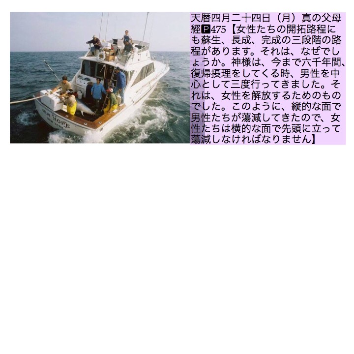 天暦 四月 二十四日 (月) 真の父母經P475 【女性たちの開拓路程にも蘇生、長成、完成の三段階の路程があります。それは、なぜでしょうか。神様は、今まで六千年間、 復帰摂理をしてくる時、男性を中心として三度行ってきました。それは、女性を解放するためのものでした。このように、縦的な面で男性たちが蕩減してきたので、女性たちは横的な面で先頭に立って蕩減しなければなりません】