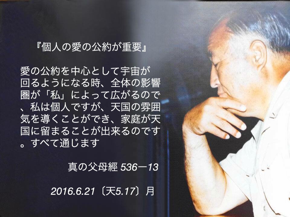 愛の公約を中心として宇宙が回るようになる時、全体の影響圏が「私」によって広がるので 、私は個人ですが、天国の雰囲気を導くことができ、家庭が天国に留まることが出来るのです。すべて通じます。真の父母經 536-13 2016.6.27 [天5.17] 月