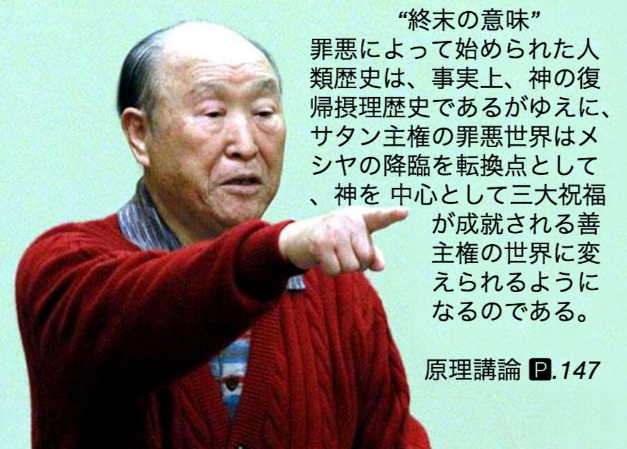 “終末の意味”罪悪によって始められた人類歴史は、事実上、神の復帰摂理歴史であるがゆえに、サタン主権の罪悪世界はメシヤの降臨を転換点として、神を中心として三大祝福が成就される善主権の世界に変えられるようになるのである。