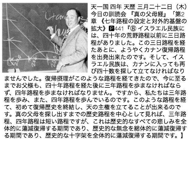今日の訓読会 『真の父母経』 「第2章 《七年路程の設定と対外的基盤の拡大》 P441 『⑧イスラエル民族には、四十年の荒野路程以前に三日路程がありました。この三日路程を経たあとに、ようやくカナン復帰路程を出発出来たのです。そして、イスラエル民族は、カナンに入っても再び四十数を探して立てなければなりませんでした。復帰摂理がこのような路程を経てきたので、今に至るまでお父様も、四十年路程を経た後に三年路程を歩まなければならず、四年路程を歩まなければなりません。ですから、私たちは三年路程を歩み、また、四年路程を歩んでいるのです。このような路程を経て、初めて復帰歴史を終結し、天の主権を立てることが出来るのです。真の父母を探し出すまでの歴史路程を中心として見れば、三年路程、四年路程は短い路程ですが、これは歴史的なすべての悲しみを全体的に蕩減復帰する期間であり、歴史的な無念を総体的に蕩減復帰する期間であり、歴史的な十字架を全体的に蕩減復帰する期間です。】