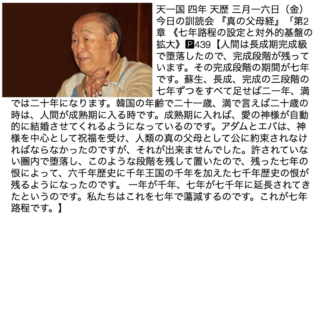 天ー国 四年 天歴 三月ー六日 (金) 今日の訓読会 『真の父母経』 「第2章 《七年路程の設定と対外的基盤の拡大》 P439 【人間は長成期完成級で堕落したので、完成段階が残っています。その完成段階の期間が七年です。蘇生、長成、完成の三段階の七年ずつをすべて足せば二ー年、満では二十年になります。韓国の年齢で二十ー歳、満で言えば二十歳の時は、人間が成熟期に入る時です。成熟期に入れば、愛の神様が自動的に結婚させてくれるようになっているのです。アダムとエバは、神様を中心として祝福を受け、人類の真の父母として公に約束されなければならなかったのですが、それが出来ませんでした。許されていない圏内で堕落し、このような段階を残して置いたので、残った七年の恨によって、六千年歴史に千年王国の千年を加えた七千年歴史の恨が 残るようになったのです。ー年が千年、七年が七千年に延長されてきたというのです。私たちはこれを七年で藻減するのです。これが七年路程です。】