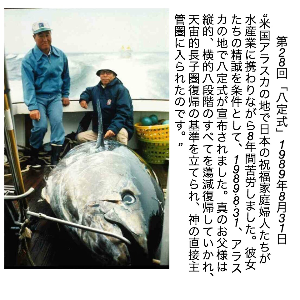 "米国アラスカの地で日本の祝福家庭婦人たちが水産業に携わりながら8年間苦労しました。彼女たちの精誠を条件として、1989.8.31,アラスカの地で八定式が宣布されました。真のお父様は縦的、横的八段階のすべてを蕩減復帰していかれ、天宙的長子権復帰の基準を立てられ、神の直接主管圏に入られたのです。"