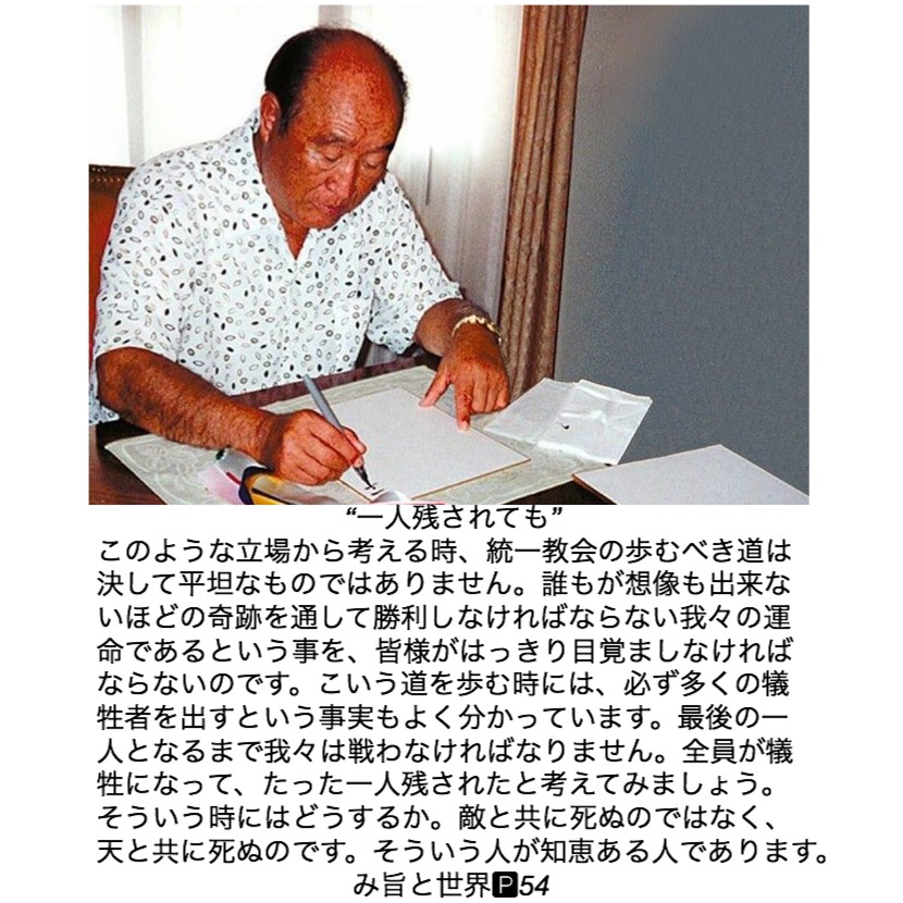 このような立場から考える時、統一教会の歩むべき道は決して平坦なものではありません。誰もが想像もできないほどの奇跡を通して勝利しなければならない我々の運命であるということを、皆様がはっきり自覚しなければならないのです。こういう道を歩む時には、必ず多くの犠牲者を出すという事実もよく分かっています。最後の一人となるまで我々は戦わなければなりません。全員が犠牲になって、たった一人残されたと考えてみましょう。そういう時にはどうするか。敵と共に死ぬのではなく、天の父と共に死ぬのです。そういう人が知恵ある人であります。
